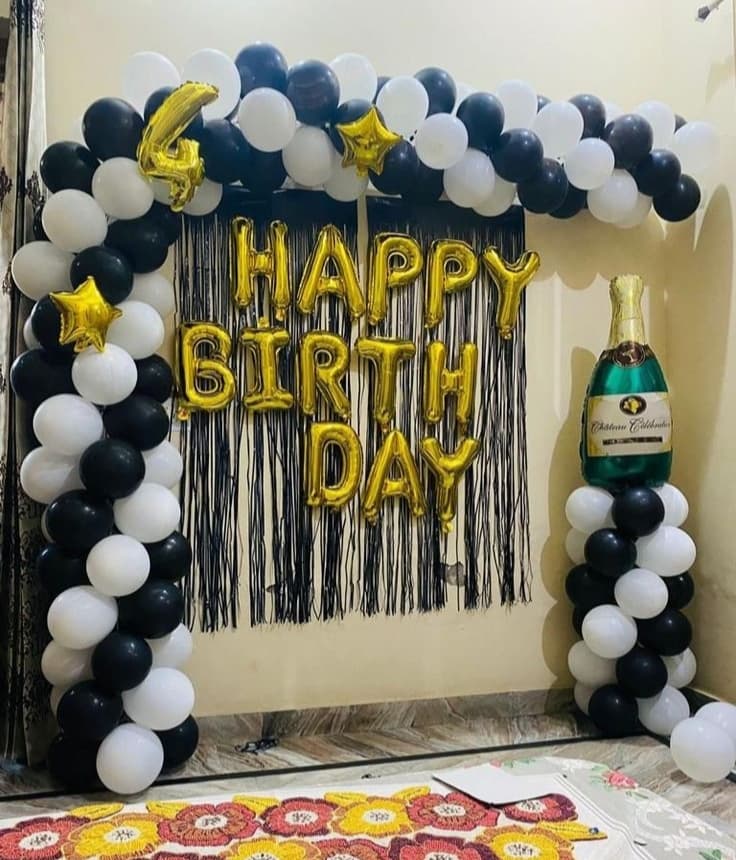 Inclusive of all charges Order on WhatsApp Call us to orderSurprise your loved ones with this adorable Black and White themed room decoration, featuring a ‘Happy Birthday’ foil banner, themed balloons/Foils, and frills.