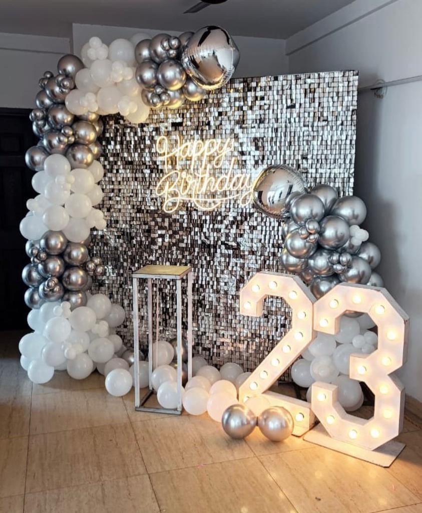 Inclusive of all charges Order on WhatsApp Call us to orderSurprise your loved ones with this premium Sequin backdrop decoration, featuring a ‘Happy Birthday’ neon light, themed balloons, LED Age Letter and cake table.