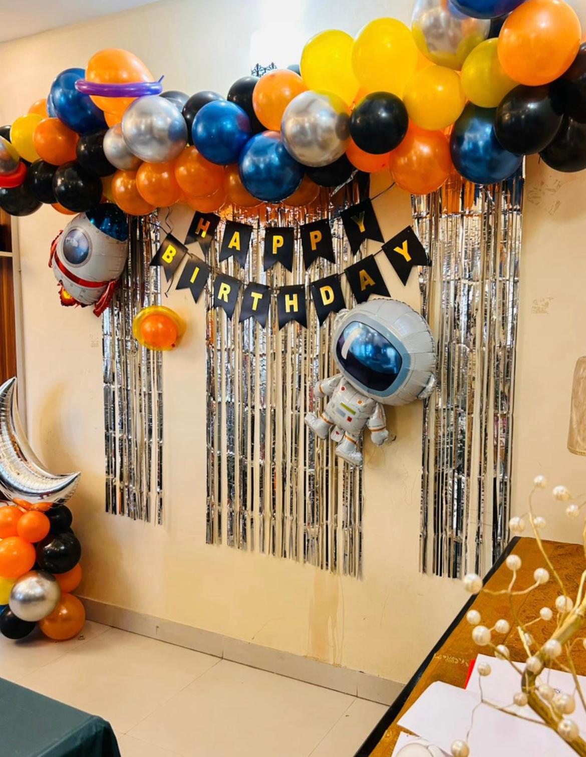 Inclusive of all charges Order on WhatsApp Call us to orderDelight your loved ones with this exciting Space-themed room decoration, complete with a ‘Happy Birthday’ banner, themed balloons, foils, and frills.