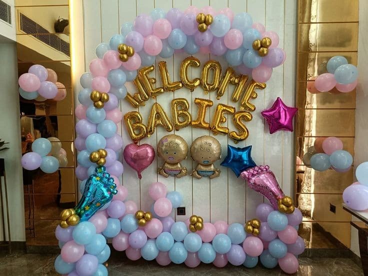 Welcome your baby Girl/Boy with a beautiful room decoration featuring multi color balloons, foil banners, and adorable themed decor—perfect for a joyful homecoming!