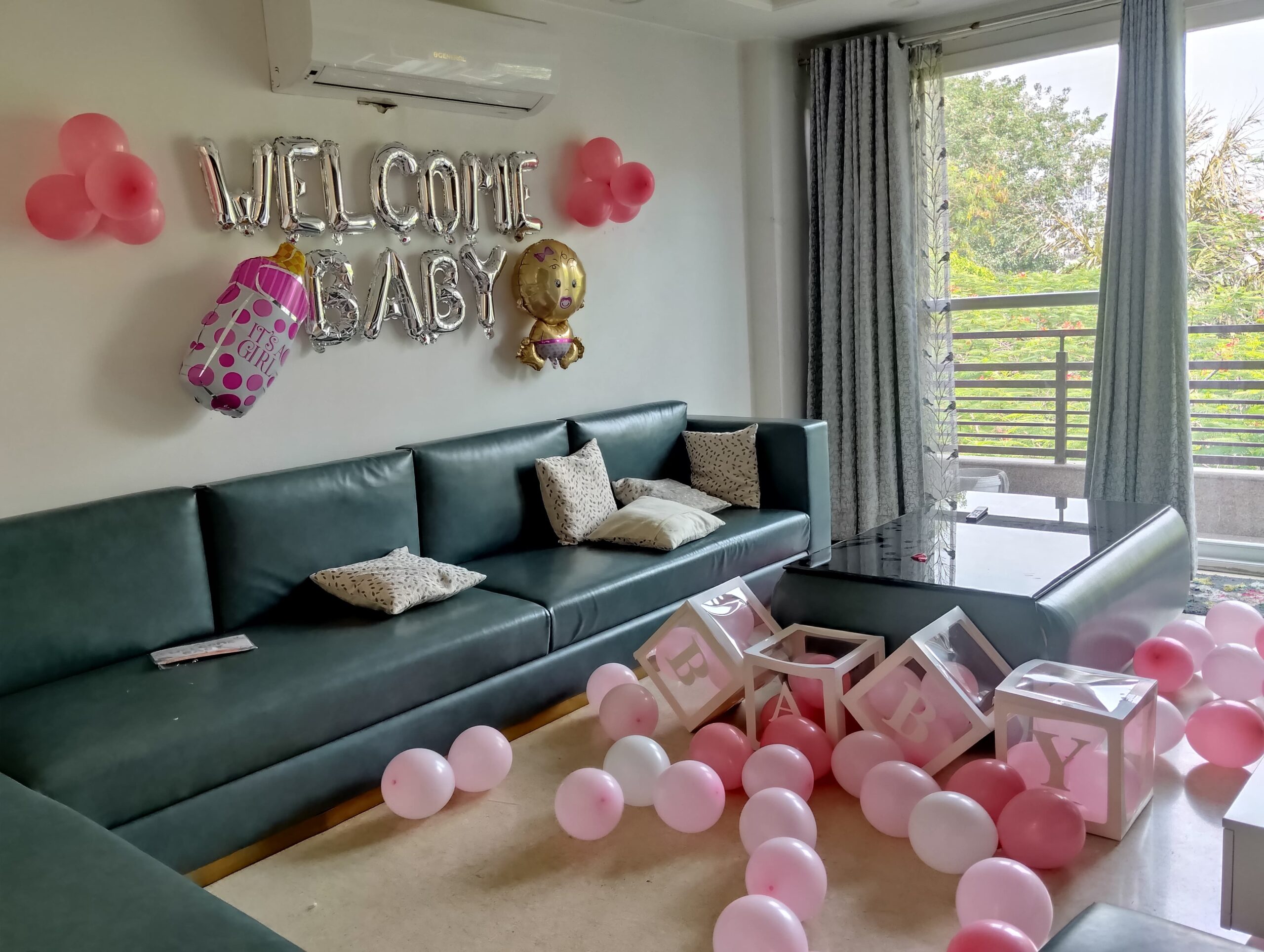 Welcome your baby girl with a beautiful room decoration featuring pink balloons, foil banners, and adorable themed decor—perfect for a joyful homecoming!